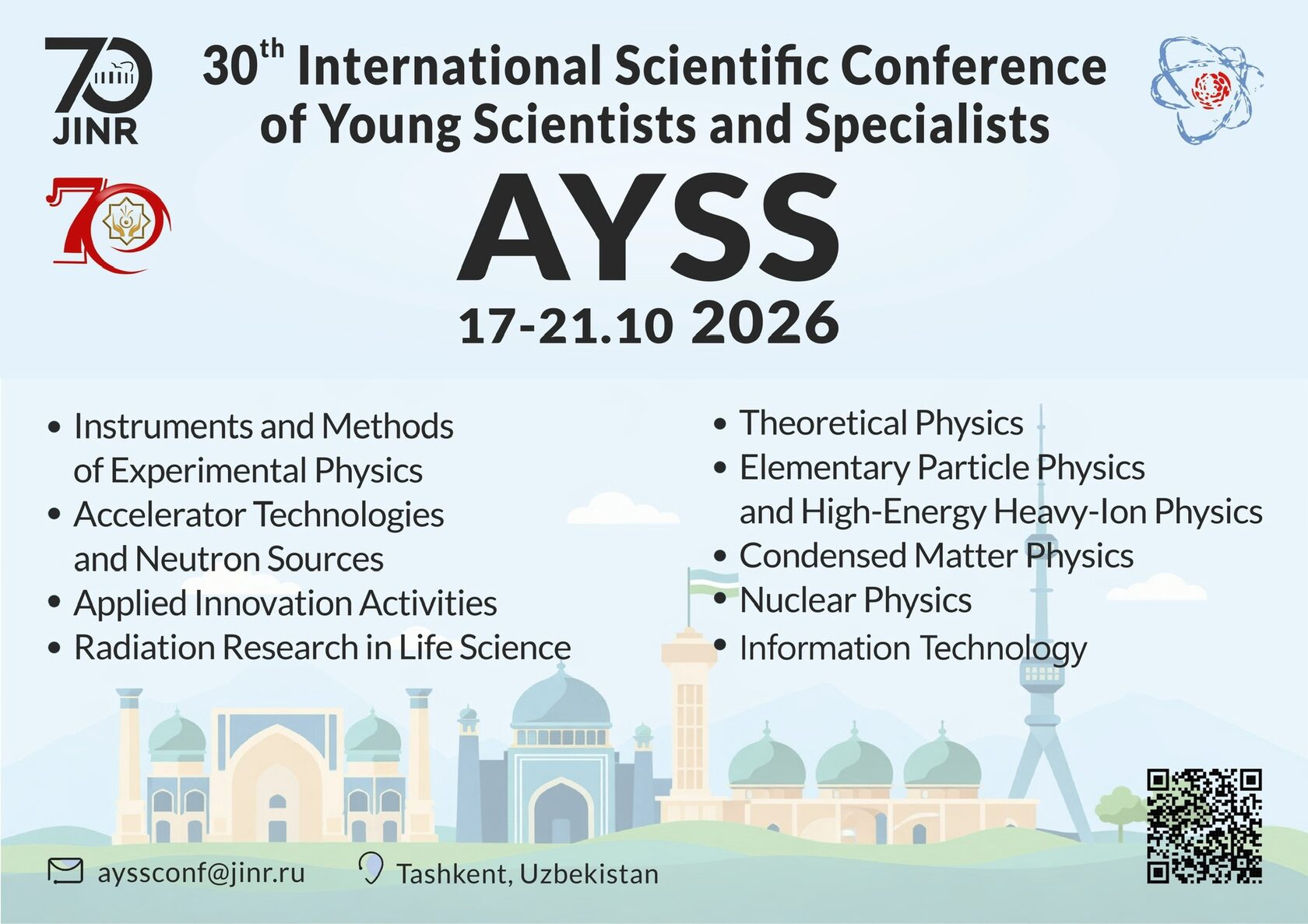 С 17 по 21 октября в Ташкенте пройдёт 30-я Международная научная конференция AYSS-2026. К участию приглашаются студенты, молодые учёные и специалисты до 35 лет включительно со всего мира.